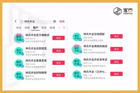 以林氏木业为例,其在抖音上开通了多个账号,有官方运营的,也有各个门店自己运营的。这样做的好处是多个方向出击,某个账号就精准定位某一个地区的垂直受众或某类人群,还可以实现账号与账号之间、账号与品牌之间的相互导流。