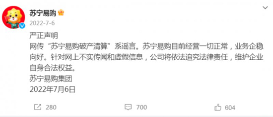 2022年7月6日凌晨,苏宁易购在官方微博中发表声明称网传“苏宁易购破产清算”系谣言,并表示公司经营一切正常。数月后的2022年11月9日,苏宁易购再次发声否认网传“被供销社收购”传闻。