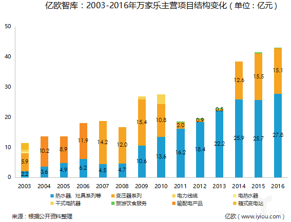 2013年,万家乐向施耐德总部购买原合资企业顺特电气设备公司10%股权,万家乐累计持有60%股权,顺特电气设备公司输配电业务报表的合并给万家乐提供了12.66亿元的收入,使万家乐整体业绩得到提升。即从2013年12月底,万家乐的主营业务恢复到厨卫电器、输配电设备生产和销售。