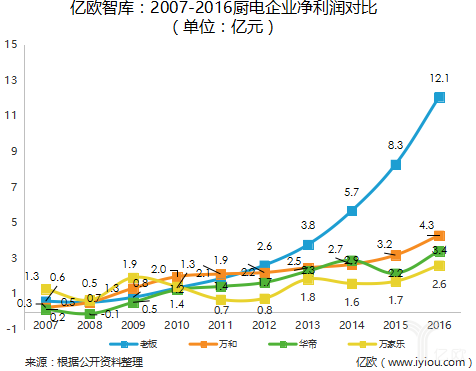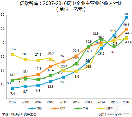 然而回到厨卫电器领域,万家乐并没有得到理想增长,同时国内厨卫电器已经形成,以老板、方太、帅康、华帝为代表的厨卫企业的崛起,海尔、美的等综合性家电集团对厨卫电器的进攻。2016年万家乐年报中也提到“受行业竞争加剧、自身品牌建设及设备更新持续投入不足、电商销售渠道拓展较迟等因素的影响,报告期内,厨卫电器业务板块利润率呈下降趋势,行业竞争力有所减弱。”