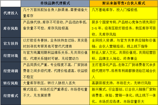 区域合伙人与财运来总部共享供应链平台和品牌资源,享受与官方平等的产品资源和利润空间,并承担区域内产品销售,品牌推广职责,拥有财运来品牌长期区域授权。合伙人通过财运来品牌新零售模式,渠道拓展与官方平台资源联为一体,建立共同价值观,品牌理念。真正意义上打通全渠道营销的格局。