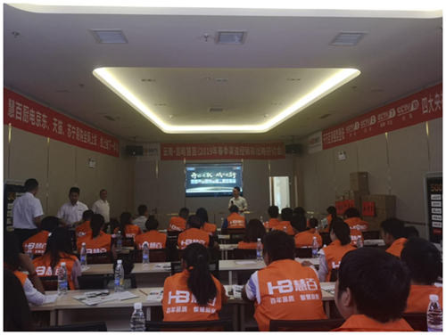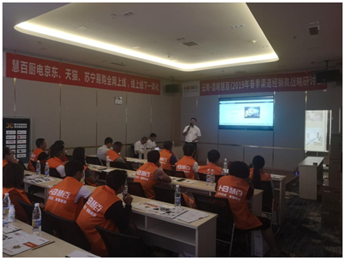 会议开始,昆明五点梅商贸有限公司总经理洪总上台发表致辞,对远道而来的慧百电器总部精英团队以及广大经销商的到场支持表示热烈欢迎。洪总表示,2018年,在厨电市场整体下滑的不利环境中,慧百电器逆势而上,创造了行业奇迹,销售额实现300%的同比增长,相信2019年在大家的共同努力下,定能开拓进取,再创佳绩。