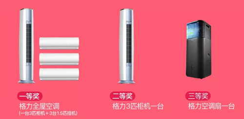 福利不断,精彩不断!活动期间顾客消费下定每满2000元可获得一张“格力空调任性享”抽奖券,买得越多,奖券越多,中奖几率越高。格力全屋空调、格力3匹柜机、格力空调扇陪您冰爽一夏。