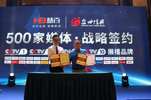 本次会议为现场嘉宾准备了一大波惊喜,那便是亲眼见证强强联合、隆重盛大的签约仪式。慧百总部刘总分别与品牌营销团队代表、央视代表进行合作签约仪式,并在现场嘉宾的热烈掌声中将这重要一刻永远地留在照片上,也深深地印刻在慧百电器的历史发展纪念册上。这辉煌灿烂的时刻,将本次会议气氛推上了高潮!