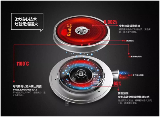 红日自主研发的“高红外发射率多孔陶瓷节能燃烧器技术”,是其红外线灶的一大技术优势。该技术于2011年入选了国家十二五计划重点节能技术推广目录,2015年更是入选了国家发改委组织评定的中国“双十佳”最佳节能技术。