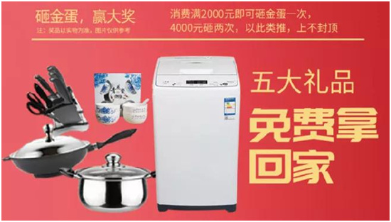 活动期间:购买满2000元,砸金蛋1次;满4000元,砸金蛋2次,以此类推(中奖者必须合照转发朋友圈)。