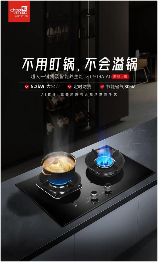 2、作为国家“健康燃气灶”起草单位,我们今年加大了智能燃气灶的研发力度。当大家还在把定时、防烫当作智能灶去销售时,我们已经开发出了第一款真正意义的智能灶:超人智能养生灶。这款灶的最大亮点就在于,它能通过AI算法,还原粤菜大师老火靓汤全程控火技术,实现全程无需盯锅、不会溢锅,一键煲出鲜美可口的养生汤。