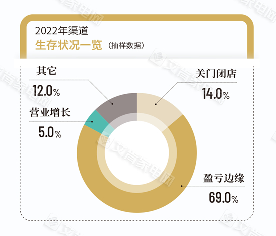 2022年末疫情防控政策优化,将迎来一个新的开始。但始于2020年春季的疫情对线下冲击侵扰已经达三年时间并在2022年到达顶点。不容置疑的是,线下渠道的生存状况遭到了严峻的挑战。居然之家、红星美凯龙、宜家等建材商场去年频频出现的闭店风潮,已经说明了这一点。同时,据艾肯家电网对2022年厨电渠道经销商的一则抽样电话调研显示,在随机抽样的700家电话名录中,有14%已经选择关门闭店、69%的经销商表示经营已经在亏损边缘、仅有5%的经销商表示对比去年同期有增长,另有12%的电话反复无人接听或表示不便多说。由此可见,线下渠道在2022年遭受的创伤之深,其活力恢复和信心重建,还有待时日。(如图)