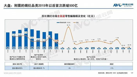 2022年奥维云网(AVC)推总数据显示,烟灶品类零售额466亿元,同比下滑11.0%,零售量3987万台,同比下滑15.0%。自2015年以后烟灶规模首次跌破500亿,油烟机零售需求首次跌破2000万台。