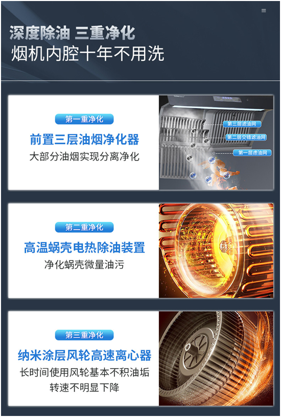 在硬核方面,乐铃吸油烟机采用三重净化技术。第一重净化,前置三层专利油烟净化器;第二重净化,高温蜗壳电热除油装置;第三重净化,纳米涂层风轮高速离心器,烟机内腔十年不用洗。