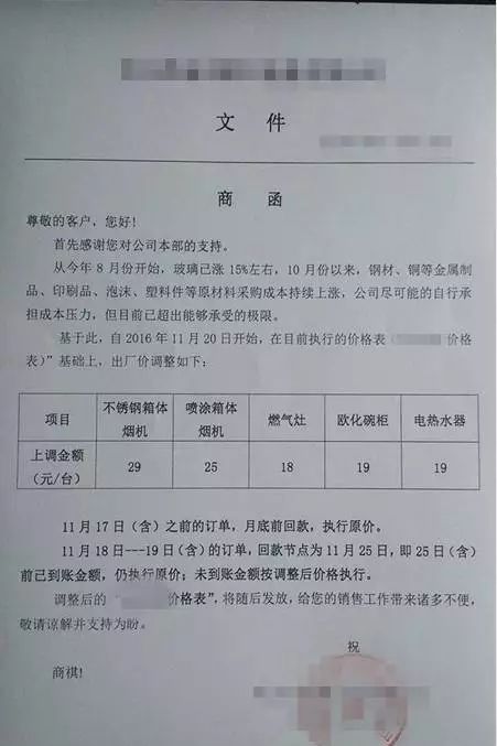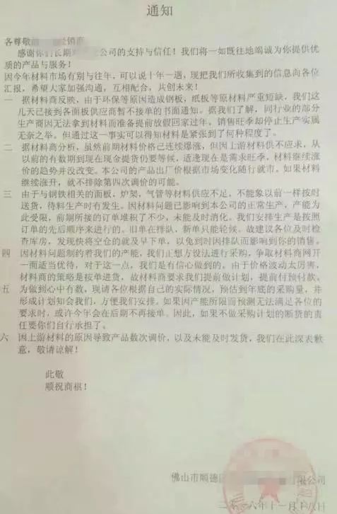 面对突如其来的原材料价格大幅上涨,时间又恰逢年末,各厂商纷纷发函向渠道叙述原因,均表示无奈之下进行价格调整,希望能够得到渠道商的认可。