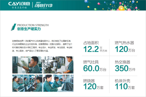创意电器历经多年精心耕耘,目前年产量高居业内前列,实现燃气热水器120万台,燃气灶具60万台,热交换器350万件,燃烧器120万套,机体外壳100万套。以领先科技以及完美可靠品质,帮助中国家庭构建美好厨房生活。除此以外,创意电器在产品研发设计、生产管理、运营能力、门店铺设等均取得成熟稳健发展,品牌展现鲜活生命力与活力。短短十余载,创意电器成为国内知名厨电品牌的代名词,完善厨电系列市场产品线,收获极佳口碑。