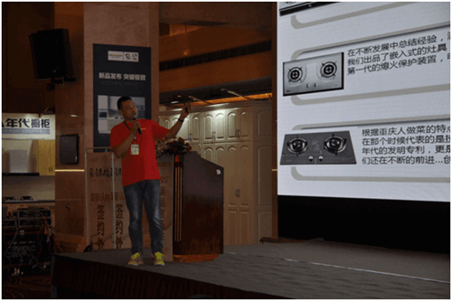 最后,年代厨卫技术总监董昭勇先生上台介绍了年代风火聚能灶的一些升级改进。自2012年,年代风火聚能灶一经推出即受到市场的追捧,其独特的燃烧结构、超大的火力、高达72.6%热效率更是人们关注的焦点。而此次发布会上,董昭勇先生展示了年代新风火聚能灶从分火器到点火针、喷嘴、升降台等多方面的有升级,升级后的五柱风火聚能灶性能更加,故障率更低。