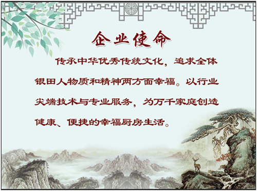 “传承中国优秀传统文化,追求全体银田人物质和精神两方面幸福;以行业尖端技术与专业服务,为万千家庭创造健康、便捷的幸福厨房生活”是银田的企业使命。树立企业使命是一个社会责任的体现。在快销快消、论技术更论品牌文化的社会,银田依旧稳步上扬不是毫无道理,一个立足社会,把“银田人”涵盖客户、经销商、供应商等在内的的企业,它必定会受到大众的支持。