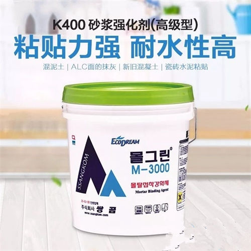 瓷砖胶的主要生产原料是水泥、石英砂等材料,另外还包括一些聚合物,是传统水泥砂浆的替代品,而瓷砖背胶是一种高分子聚合物材料。下图就是小蓝家代理的韩国双熊品牌的砂浆强化剂,中文名字:瓷砖背胶