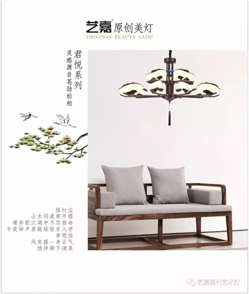 君悦系列,灵感源自松柏。松柏庄重肃穆,四季长青,历严冬而不衰,体现坚贞不屈的英雄气概和君子豁达坦荡的胸怀。灯罩如松叶针状成束,苍劲有力,灯体如松枝傲骨峥嵘。设计师们历经300多天的研发和完善,实现了从现代北欧到现代中式的成功跨越,打造更适合中国人的原创灯饰品牌。