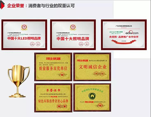公司子弹头照明是央视战略合作十大LED照明品牌,是中国LED照明品牌十强,可比优居短短一年就获得了,最具成长价值品牌、诚实守信企业、最具创新价值的家居品牌称号;