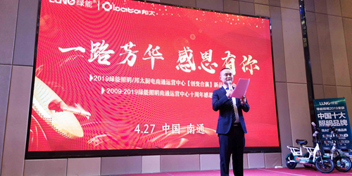 2019年4月27日,江苏南通,LUNO绿能照明南通运营中心主办的“一路芳华 感恩有你 十周年感恩答谢会”于南通诺华廷酒店隆重召开!