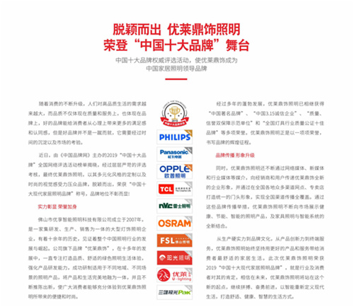 民族品牌是一个国家经济实力的象征,是一个民族整体素质的体现。优莱鼎饰照明品牌创立于2007年,作为一家专注于时尚灯饰与绿色照明研发、生产、销售的创新型照明品牌,开创了国内绿色照明生活体验的先河。优莱鼎饰持续创新,“智造”众多颠覆业界的新品,不仅为中国灯饰照明行业的发展做出了重大贡献,更是在享有盛誉的同时,拥有着不可替代的行业地位。