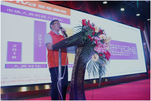 随后,冠华照明营销总监杨克承先生上台发表了关于《聚力前行打造顶级终端》的主题演讲,向在场嘉宾分享了如何运营门店终端以创造更大财富的技巧方法,旨在让冠华照明全国各地的经销商都能成为各自区域市场的大赢家。加入冠华照明,无异于迈入了金碧辉煌的财富殿堂。现场嘉宾纷纷把杨总监所提到的重点内容记录下来,等到日后运用在日常的销售工作中,以此助力门店的经营发展。