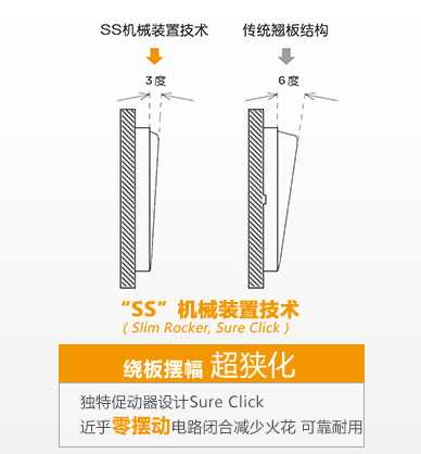 独有“SS”机械装置技术(Slim Rocker,Sure Click)在整体纤薄化之余,低至3°细腻摆幅实现轻巧手感,减少火花,引发完美触感,稳定更耐用。