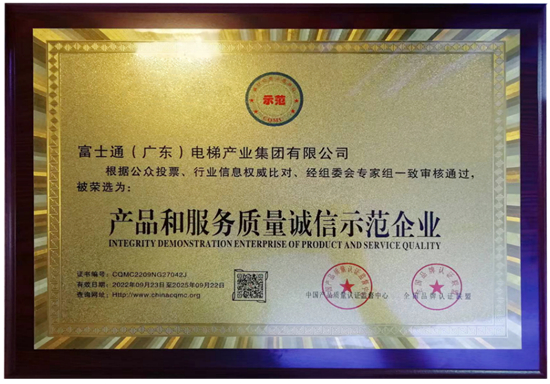 2022年9月23日,在中国产品质量认证监督中心和全国品牌认证联盟联合开展的“产品和服务质量诚信承诺”主题活动上,富士通电梯集团凭借诚信、责任的原则,打造规范的管理、优质的产品和专业的服务,荣获“产品和服务质量诚信示范企业”荣誉称号,并接受中国产品质量认证监督中心颁发的相关公告证书。