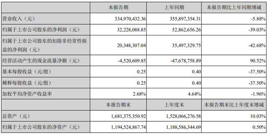 10月22日,友邦吊顶发布2019年半年度报告,公司实现营收收入达3.35亿,比上年同期减少5.88%,其中归属于上市公司股东的净利润为3222.8万元,比去年同期减少39.03%。