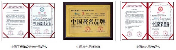 晟王门业先后荣获中国企业知名品牌发展协会颁发的“质量信得过产品”荣誉证书、中国建材产品评估委员会颁发的“工程建设推荐产品” 荣誉证书、佛山市质量管理协会颁发的“会员单位”证书、 以及“质量服务诚信星级单位”、 “副会长单位”等证书。