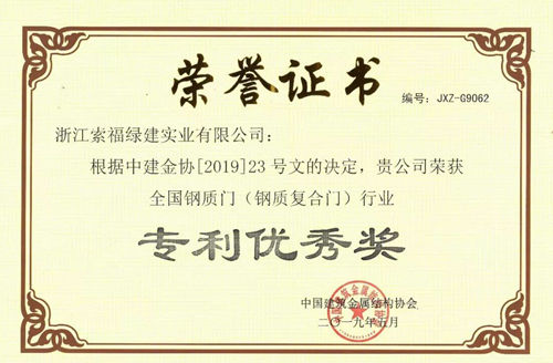 近日,索福门业再闻喜讯,荣获由中国建筑金属结构协会颁发的全国钢质门(钢质复合门)行业“专利优秀奖”称号!在此特对我司荣誉榜上再添勋章表示热烈的祝贺!