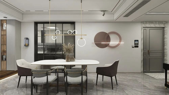 餐厅区域简约明了,色调素雅温馨,方形餐桌使用圆角设计,墙面装饰与吊灯都采用圆形。