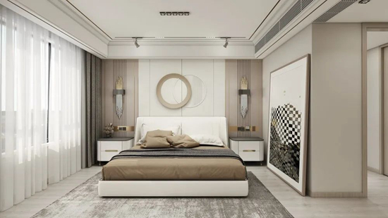主卧色调素雅温馨,淡淡的卡其色舒适淡雅,床头墙面背景使用对称设计,端正稳健。