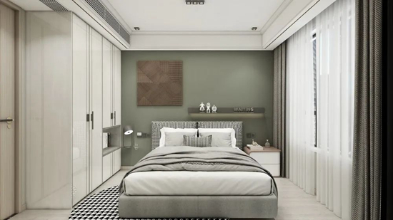 客卧床头墙使用橄榄绿色,一股自然气息扑面而来,悬挂实木装饰板与置物架,时尚而不单调。
