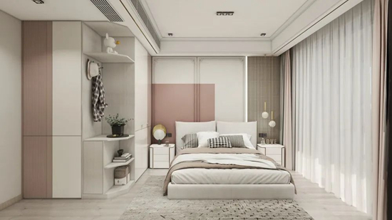 定制到顶衣柜,造型简约而有设计感,床头区域预留开放格,方便随手放置杂物或是收纳书籍。