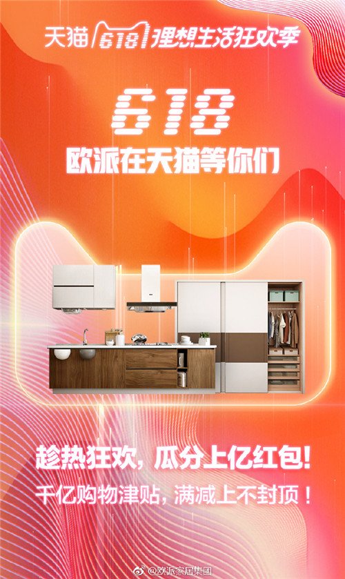 欧派家居:抽4999元合同减免大奖、厨房用品9.9元限量秒杀、店铺优惠券满1000减300、全店通用特权订金¥100抵¥400,门店抵扣立省300元……福利N多,种草季超长,欧派官方旗舰店还提醒消费者“定制好物就要趁热购”!