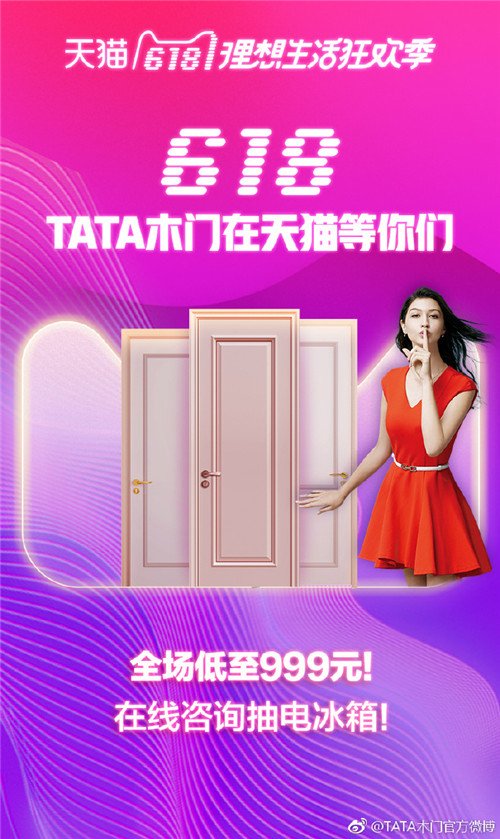 TATA木门:疯抢万元家电壕礼,参与微淘互动pick明星同款,get大额无门槛券……触手可及的品牌好货,优惠力度也超出想象。同时TATA木门官方微博表示“只有真正使用过产品本身才具备产品好用的发言权,TATA木门明星用户宋佳、朱亚文在使用过静音门之后,强烈推荐TATA木门‘雨露’、‘嵌艺’,618套餐价更合适”。