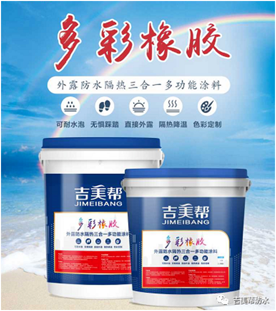 吉美帮防水在此次建博会发布了两款明星产品,分别是多彩橡胶-外露防水隔热三合一多功能涂料和长胶粘弹胶-自愈密封全能防水膏。