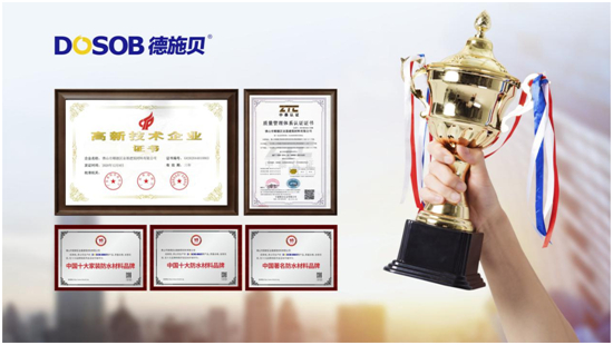 德施贝自成立来凭借过硬的产品,自主研发的技术,陆续通过“ISO9001:2008质量管理体系”、“中国绿色建材产品推广”、“中国建材首选品牌”、“国家建材AAA级质量服务体系”等认证,并在《中国品牌网》举办的“行业十大品牌评选盛典”活动中一举夺得“中国十大防水材料品牌”、“中国十大家装防水材料品牌”、“中国著名防水材料品牌”三大荣誉。