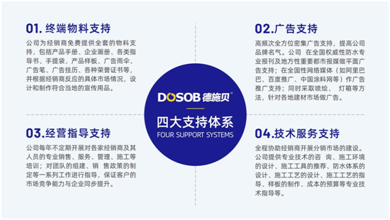 在选择加盟品牌的过程中,除了考虑产品品质、企业实力等,企业对经销商的帮扶也是加盟者衡量一个品牌可靠程度的关键点。德施贝拥有4大支持政策,这无异于给经销商们吃下了一颗“定心丸”。