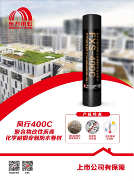 种植屋面通常长期处于潮湿的环境之中,其植物根系穿透力极强,防水层必须要用耐根系穿刺防水材料。比如东方雨虹的风行400C聚合物改性沥青化学耐根穿刺防水卷材。