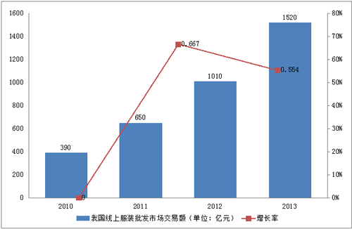2012年,我国服装批发市场电子商务交易额为1010亿元,同比增长55.4%。2013年我国服装批发市场电子商务交易额为1520亿元,同比增长50.5%。预计2014年服装批发市场电子商务交易额为2200亿元,同比增长45%。