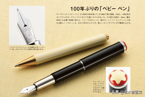 2022年上市,有黑银和象牙白金两个颜色,白金配色价格稍微贵一点点,都是使用了14K金笔尖,书写长度大概在10cm,属于极其小巧的口袋钢笔,便携属性好。笔尖上的花纹是万宝龙成立初期别人拍摄的勃朗峰照片。