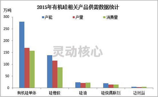 据灵动核心产业研究中心对有机硅相关产品市场供需情况分析,2015年国内有机硅单体企业共计14家(包含张家港道康宁),其中在产企业12家(四川硅峰、江苏弘博年内停车),单体总产能280万吨,同比增加25万吨,产能年增幅9.8%,2015年单体总产量165万吨左右,同比增加13万吨,产量年增幅8.6%;