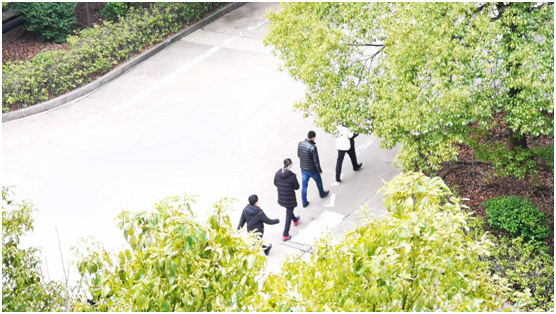 为确保用餐安全,金德园区内严格执行“相距一米,排成一列,分时分批用餐。”偶然间遇到一列井然有序的纵队经过,让人仿佛有种在部队的错觉。这一幕,让我们感动,也让我们坚信,在每一位人民的共同努力下,疫情终会被击退,我们终将迎来生机勃勃的春天。