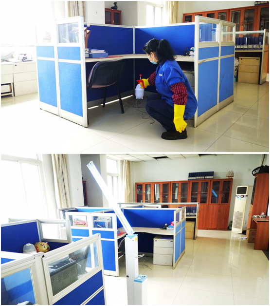 办公室里,保洁阿姨正拿着84消毒液为我们进行办公室消毒。将消毒液喷洒于桌面、桌底、椅子、挡板……做到每个角落都不放过,随后架起紫外线消毒灯,双重消毒下,让病菌无处藏匿!