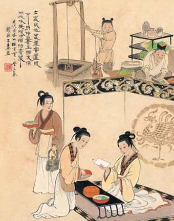 唐朝以前,人们多采用席地而坐的生活方式,“席”的功能等同于我们现在常用的各种椅类家具。席地而坐时,人的视线和身体所及的高度也决定了漆案、漆几等家具的高度和比例尺度是否合理。例如常见的漆案案面高度多在10厘米~20厘米之间。漆几的高度一般在30厘米~40厘米之间,可适宜于人们“隐几而坐”。食案仅有2厘米高的短足,便于人们托盘送食利于放置,案面四沿还有2至3厘米高起的拦水线,防止食物汤水外溢。