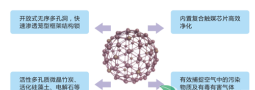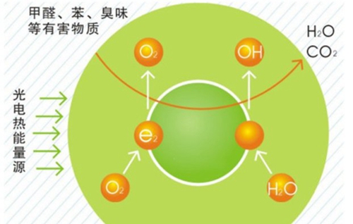 复合触媒能同时催化甲醛、氨气、苯类、TVOC、硫化氢等多种有害气体与空气中的氧气发生反应,进行催化,生成水和二氧化碳。