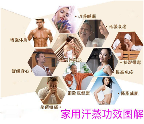 家用汗蒸房一般用天然实木制作可移动房体,内置纳米碳晶发热板和天然能量石--托玛琳,智能环保健康;发5-14微米的远红外线(医学上称之为“生命之光”)与人体发出的远红外线同样波长。可以引起细胞内水分子加速运动,给细胞洗澡,加速血液循环,促进新城代谢,打开毛孔达到相关效果。
