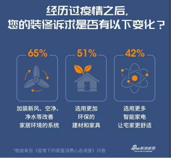 2020年2月1日新浪家居发布了《疫情下的家居消费心态调查》问卷,希望能够在第一时间了解到家居消费者的真实诉求和心声。从调查中不难看出人们对于家居健康有了更多的关注,同时也对家装材料的环保性以及室内空气质量有了更多的要求。