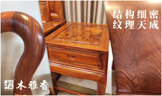 同时,缅甸花梨木在硬度、径级、料质细腻度以及稳定性方面都较为理想,木雅香团队善于利用它的纹理和稳定性质,更好地运用线条的流畅质感、设计艺术造型和精美饰样,让消费者用上更美观、更好用的缅甸花梨木家具。