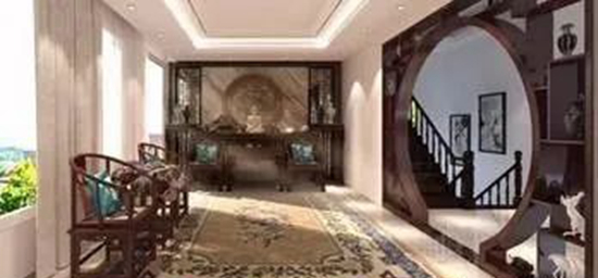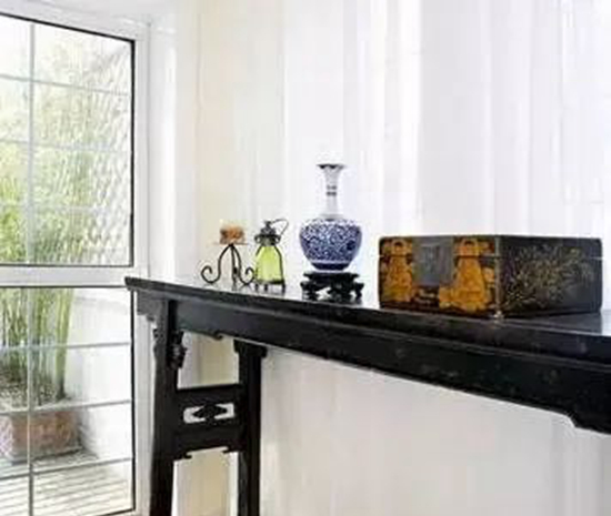 现代家居中,玄关是开门后的第一道风景,也是给人第一印象的地方,反映了主人文化气质。如在现代居室玄关处放置一香几或条案,案上放一青花瓶或两边置绿色盆景,客人进门便觉古意盎然。
